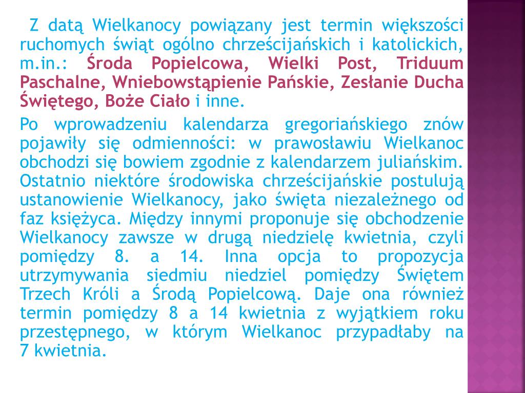 Z datą Wielkanocy powiązany jest termin większości ruchomych świąt ogólno chrześcijańskich i katolickich, m.in.: Środa Popielcowa, Wielki Post, Triduum Paschalne, Wniebowstąpienie Pańskie, Zesłanie Ducha Świętego, Boże Ciało i inne. Po wprowadzeniu kalendarza gregoriańskiego znów pojawiły się odmienności: w prawosławiu Wielkanoc obchodzi się bowiem zgodnie z kalendarzem juliańskim.Ostatnio niektóre środowiska chrześcijańskie postulują ustanowienie Wielkanocy, jako święta niezależnego od faz księżyca. Między innymi proponuje się obchodzenie Wielkanocy zawsze w drugą niedzielę kwietnia, czyli pomiędzy 8. a 14. Inna opcja to propozycja utrzymywania siedmiu niedziel pomiędzy Świętem Trzech Króli a Środą Popielcową. Daje ona również termin pomiędzy 8 a 14 kwietnia z wyjątkiem roku przestępnego, w którym Wielkanoc przypadłaby na 7 kwietnia.