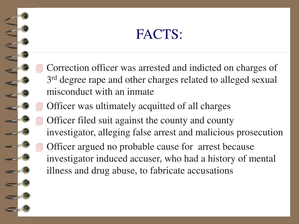 FACTS: • Correction officer was arrested and indicted on charges of 3rd degree rape and other charges related to alleged sexual misconduct with an inmate • Officer was ultimately acquitted of all charges • Officer filed suit against the county and county investigator, alleging false arrest and malicious prosecution • Officer argued no probable cause for arrest because investigator induced accuser, who had a history of mental illness and drug abuse, to fabricate accusations