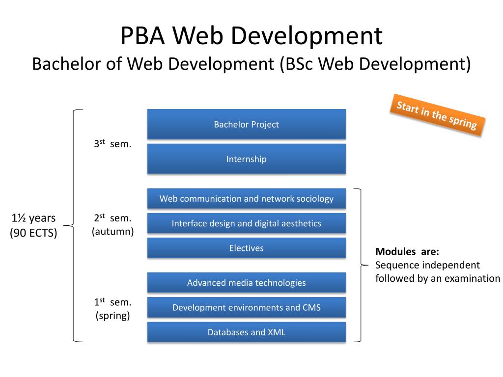 PBA Web DevelopmentBachelor of Web Development (BSc Web Development) Start in the spring Bachelor Project 3st sem. Internship Web communication and network sociology 1½ years (90 ECTS) 2st sem. (autumn) Interface design and digital aesthetics Electives Modules are: Sequence independent followed by an examination Advanced media technologies 1st sem. (spring) Development environments and CMS Databases and XML