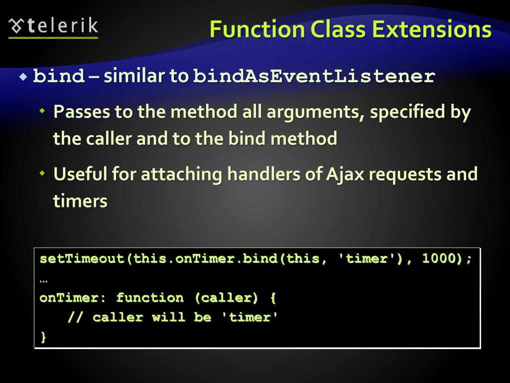 Function Class Extensions • bind – similar to bindAsEventListener • Passes to the method all arguments, specified by the caller and to the bind method • Useful for attaching handlers of Ajax requests and timers setTimeout(this.onTimer.bind(this, 'timer'), 1000); … onTimer: function (caller) { // caller will be 'timer' }