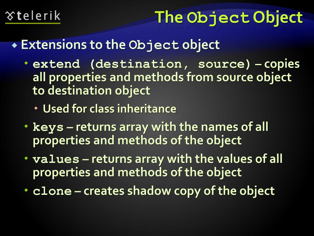 The Object Object • Extensions to the Object object • extend (destination, source) – copies all properties and methods from source object to destination object • Used for class inheritance • keys – returns array with the names of all properties and methods of the object • values – returns array with the values of all properties and methods of the object • clone – creates shadow copy of the object