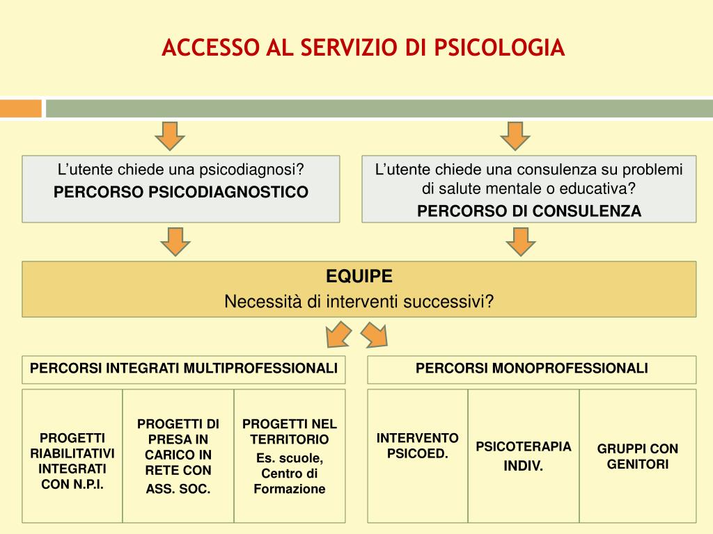 ACCESSO AL SERVIZIO DI PSICOLOGIA L’utente chiede una psicodiagnosi? PERCORSO PSICODIAGNOSTICO L’utente chiede una consulenza su problemi di salute mentale o educativa? PERCORSO DI CONSULENZA EQUIPE Necessità di interventi successivi? PERCORSI INTEGRATI MULTIPROFESSIONALI PERCORSI MONOPROFESSIONALI PROGETTI RIABILITATIVI INTEGRATI CON N.P.I. PROGETTI DI PRESA IN CARICO IN RETE CON ASS. SOC. PROGETTI NEL TERRITORIO Es. scuole, Centro di Formazione INTERVENTO PSICOED. PSICOTERAPIA INDIV. GRUPPI CON GENITORI