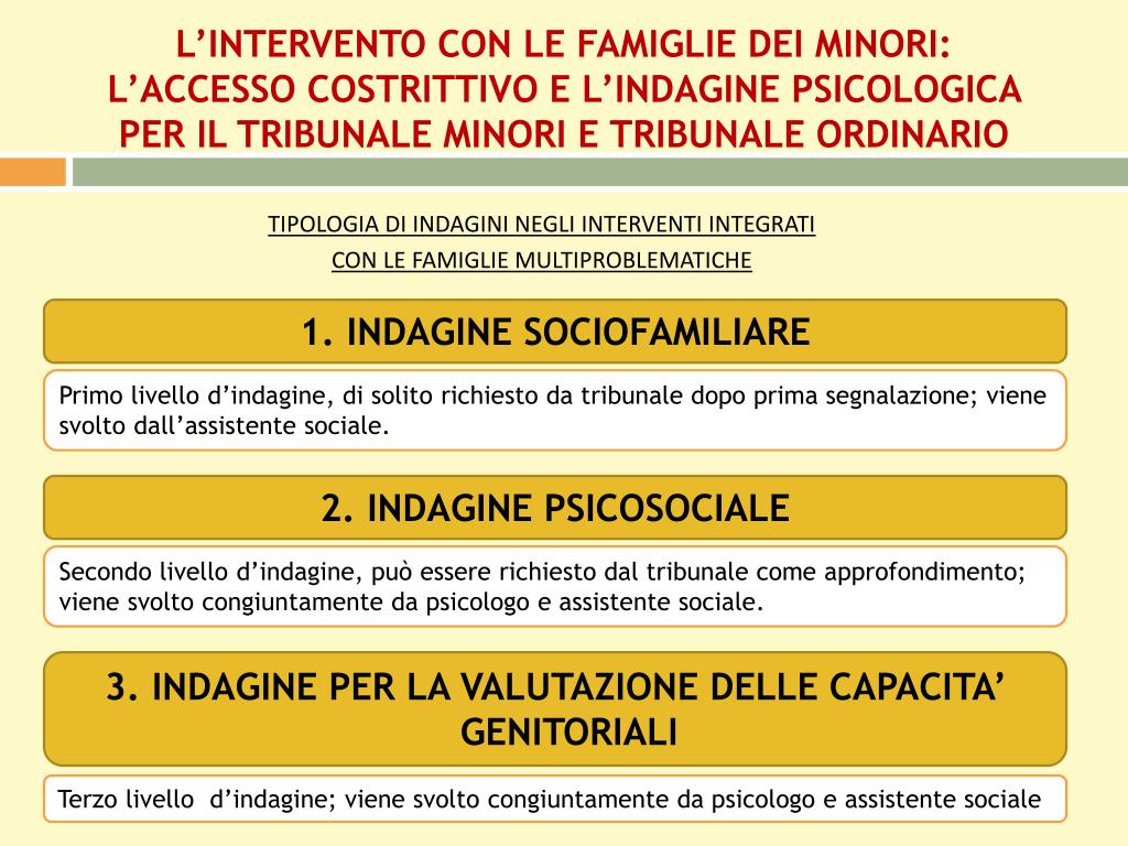 L’INTERVENTO CON LE FAMIGLIE DEI MINORI: L’ACCESSO COSTRITTIVO E L’INDAGINE PSICOLOGICA PER IL TRIBUNALE MINORI E TRIBUNALE ORDINARIO TIPOLOGIA DI INDAGINI NEGLI INTERVENTI INTEGRATI CON LE FAMIGLIE MULTIPROBLEMATICHE 1. INDAGINE SOCIOFAMILIARE Primo livello d’indagine, di solito richiesto da tribunale dopo prima segnalazione; viene svolto dall’assistente sociale. 2. INDAGINE PSICOSOCIALE Secondo livello d’indagine, può essere richiesto dal tribunale come approfondimento; viene svolto congiuntamente da psicologo e assistente sociale. 3. INDAGINE PER LA VALUTAZIONE DELLE CAPACITA’ GENITORIALI Terzo livello d’indagine; viene svolto congiuntamente da psicologo e assistente sociale