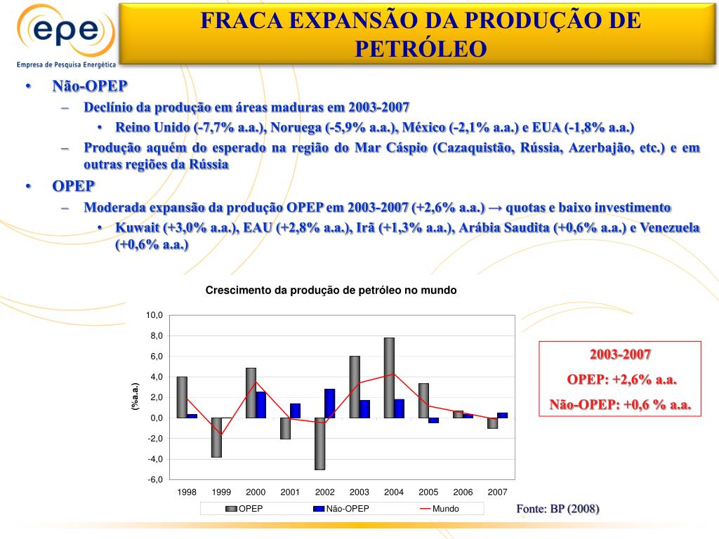 FRACA EXPANSÃO DA PRODUÇÃO DE PETRÓLEO • Não-OPEP • Declínio da produção em áreas maduras em 2003-2007 • Reino Unido (-7,7% a.a.), Noruega (-5,9% a.a.), México (-2,1% a.a.) e EUA (-1,8% a.a.) • Produção aquém do esperado na região do Mar Cáspio (Cazaquistão, Rússia, Azerbajão, etc.) e em outras regiões da Rússia • OPEP • Moderada expansão da produção OPEP em 2003-2007 (+2,6% a.a.) → quotas e baixo investimento • Kuwait (+3,0% a.a.), EAU (+2,8% a.a.), Irã (+1,3% a.a.), Arábia Saudita (+0,6% a.a.) e Venezuela (+0,6% a.a.) 2003-2007 OPEP: +2,6% a.a. Não-OPEP: +0,6 % a.a. Fonte: BP (2008)