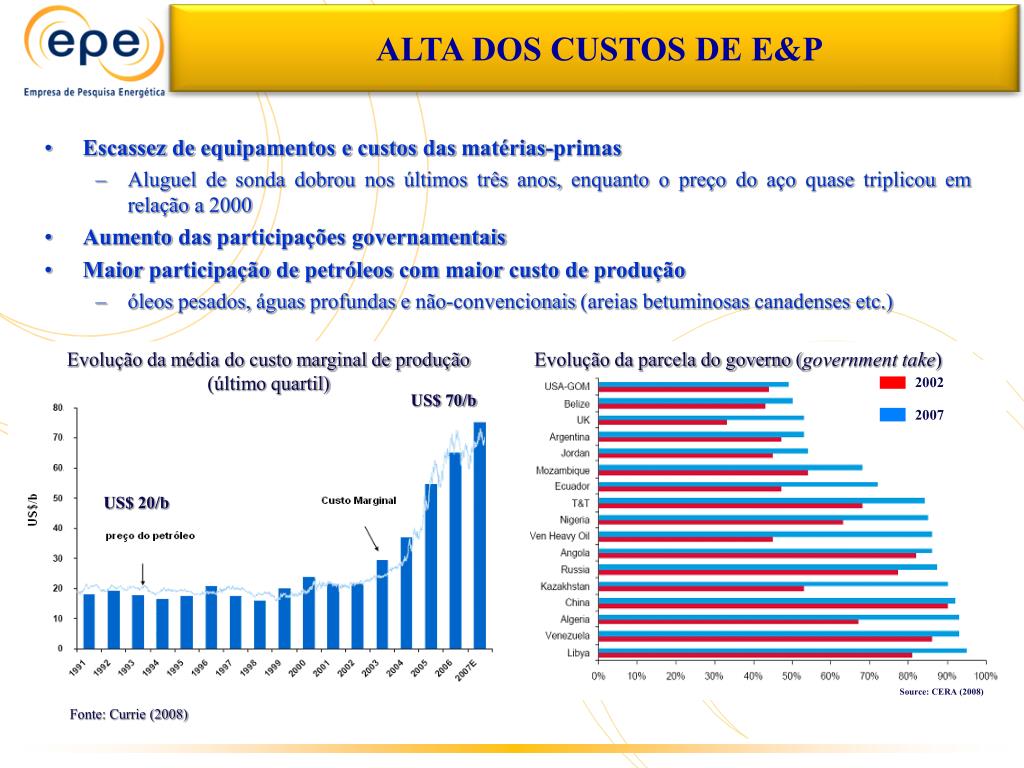 US$ 70/b US$ 20/b ALTA DOS CUSTOS DE E&P • Escassez de equipamentos e custos das matérias-primas • Aluguel de sonda dobrou nos últimos três anos, enquanto o preço do aço quase triplicou em relação a 2000 • Aumento das participações governamentais • Maior participação de petróleos com maior custo de produção • óleos pesados, águas profundas e não-convencionais (areias betuminosas canadenses etc.) Evolução da média do custo marginal de produção (último quartil) Evolução da parcela do governo (government take) Fonte: Currie (2008)