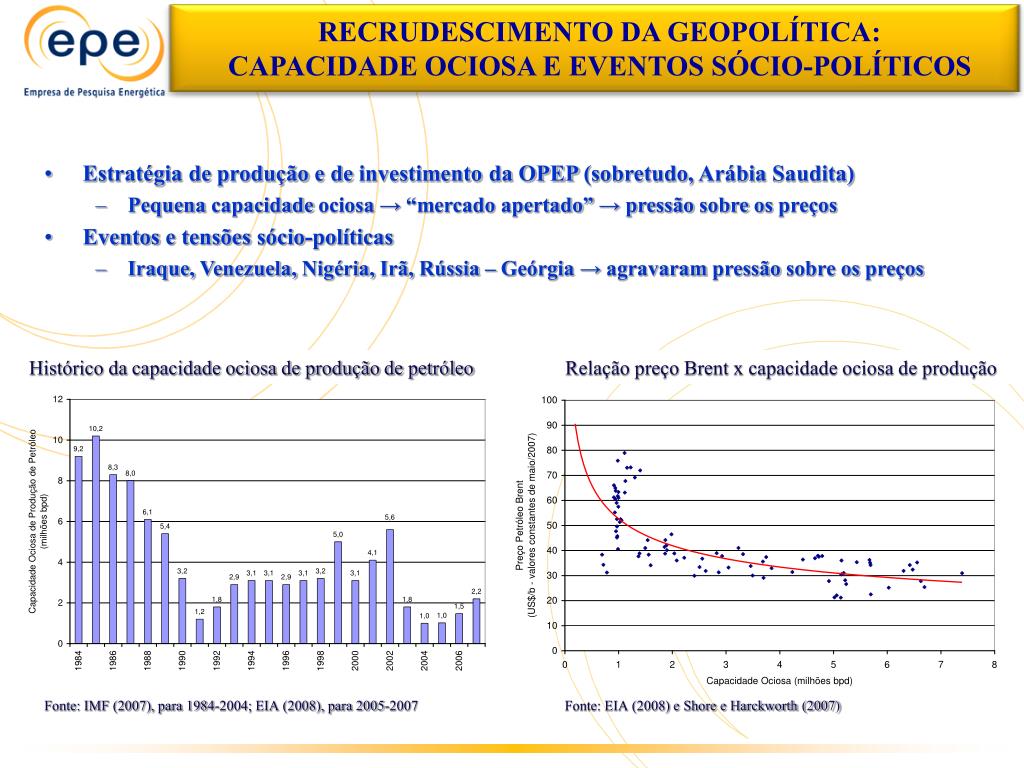 RECRUDESCIMENTO DA GEOPOLÍTICA: CAPACIDADE OCIOSA E EVENTOS SÓCIO-POLÍTICOS • Estratégia de produção e de investimento da OPEP (sobretudo, Arábia Saudita) • Pequena capacidade ociosa → “mercado apertado” → pressão sobre os preços • Eventos e tensões sócio-políticas • Iraque, Venezuela, Nigéria, Irã, Rússia – Geórgia → agravaram pressão sobre os preços Histórico da capacidade ociosa de produção de petróleo Relação preço Brent x capacidade ociosa de produção Fonte: IMF (2007), para 1984-2004; EIA (2008), para 2005-2007 Fonte: EIA (2008) e Shore e Harckworth (2007)