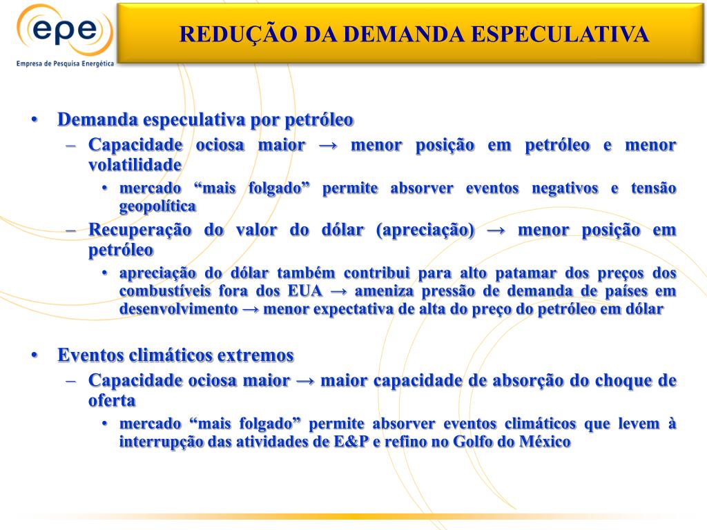 Demanda especulativa por petróleo Capacidade ociosa maior → menor posição em petróleo e menor volatilidade mercado “mais folgado” permite absorver eventos negativos e tensão geopolítica Recuperação do valor do dólar (apreciação) → menor posição em petróleo apreciação do dólar também contribui para alto patamar dos preços dos combustíveis fora dos EUA → ameniza pressão de demanda de países em desenvolvimento → menor expectativa de alta do preço do petróleo em dólar Eventos climáticos extremos Capacidade ociosa maior → maior capacidade de absorção do choque de oferta mercado “mais folgado” permite absorver eventos climáticos que levem à interrupção das atividades de E&P e refino no Golfo do México REDUÇÃO DA DEMANDA ESPECULATIVA