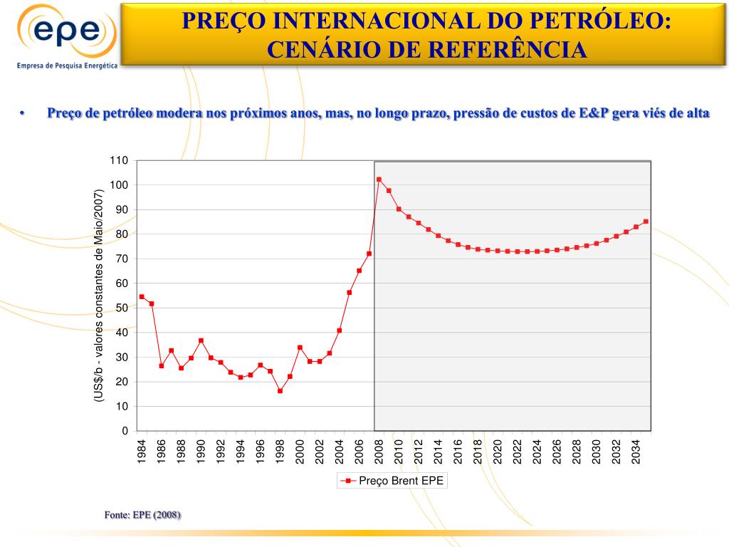 Preço de petróleo modera nos próximos anos, mas, no longo prazo, pressão de custos de E&P gera viés de alta PREÇO INTERNACIONAL DO PETRÓLEO: CENÁRIO DE REFERÊNCIA Fonte: EPE (2008)