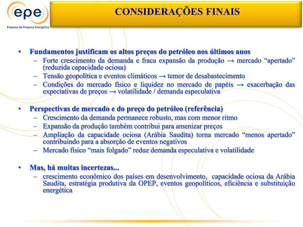 Fundamentos justificam os altos preços do petróleo nos últimos anos Forte crescimento da demanda e fraca expansão da produção → mercado “apertado” (reduzida capacidade ociosa) Tensão geopolítica e eventos climáticos → temor de desabastecimento Condições do mercado físico e liquidez no mercado de papéis → exacerbação das expectativas de preços → volatilidade / demanda especulativa Perspectivas de mercado e do preço do petróleo (referência) Crescimento da demanda permanece robusto, mas com menor ritmo Expansão da produção também contribui para amenizar preços Ampliação da capacidade ociosa (Arábia Saudita) torna mercado “menos apertado” contribuindo para a absorção de eventos negativos Mercado físico “mais folgado” reduz demanda especulativa e volatilidade Mas, há muitas incertezas... crescimento econômico dos países em desenvolvimento, capacidade ociosa da Arábia Saudita, estratégia produtiva da OPEP, eventos geopolíticos, eficiência e substituição energética CONSIDERAÇÕES FINAIS