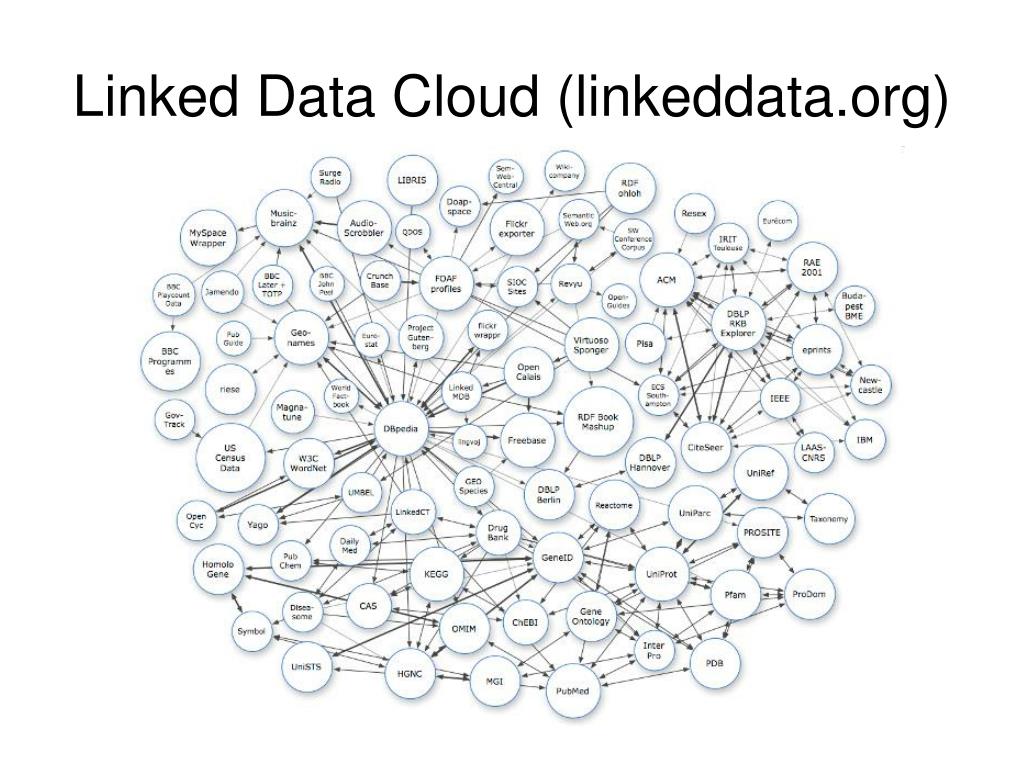 Linked Data • Linked Data is about using the Web to connect related data that wasn't previously linked • Wikipedia defines Linked Data as "a term used to describe a recommended best practice for exposing, sharing, and connecting pieces of data, information, and knowledge on the Semantic Web using URIs and RDF." • In addition to providers and consumers of linked data, there are link creators who create semantic links between different RDF datasets (e.g., links can be created between protein kinases and drugs)