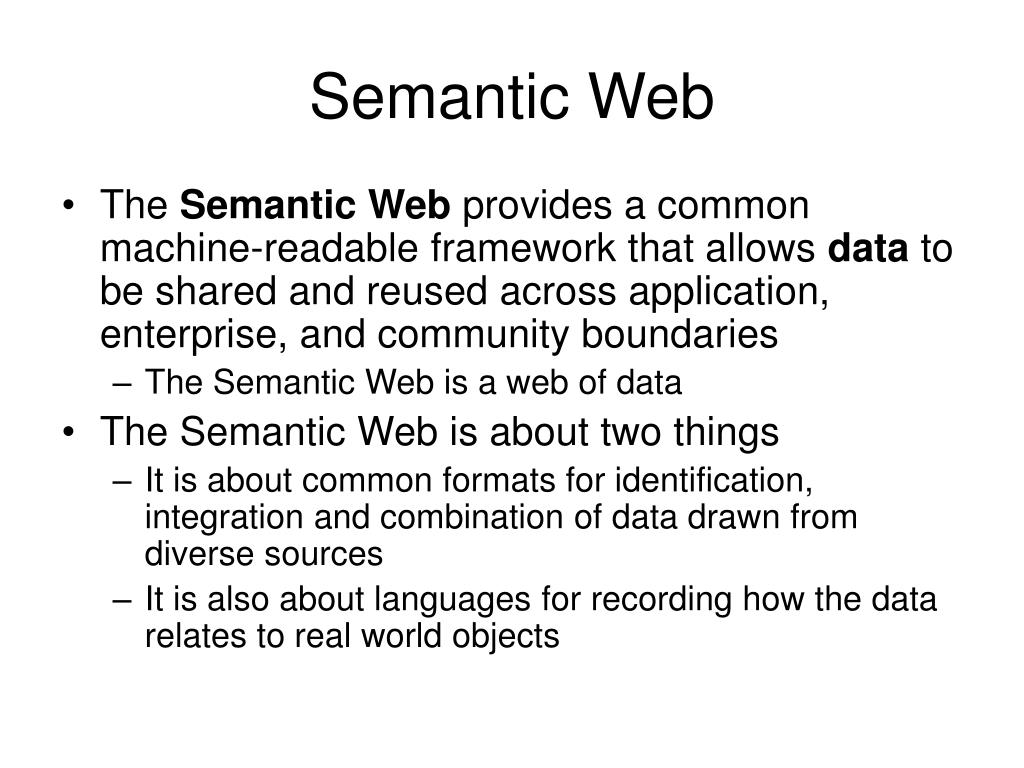 Semantic Web • The Semantic Web provides a common machine-readable framework that allows data to be shared and reused across application, enterprise, and community boundaries • The Semantic Web is a web of data • The Semantic Web is about two things • It is about common formats for identification, integration and combination of data drawn from diverse sources • It is also about languages for recording how the data relates to real world objects