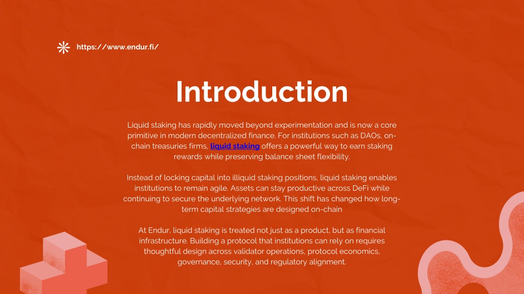 2. https://www.endur.fi/ Introduction Liquid staking has rapidly moved beyond experimentation and is now a core primitive in moderndecentralized finance. For institutions such as DAOs, on-chain treasuries firms, liquid staking offers a powerful way to earn staking rewards while preserving balance sheet flexibility. Instead of locking capital into illiquid staking positions, liquid staking enables institutions to remain agile. Assets can stay productive across DeFi while continuing to secure the underlying network. This shift has changed how long-term capital strategies are designed on-chain At Endur, liquid staking is treated not just as a product, but as financial infrastructure. Building a protocol that institutions can rely on requires thoughtful design across validator operations, protocol economics, governance, security, and regulatory alignment.