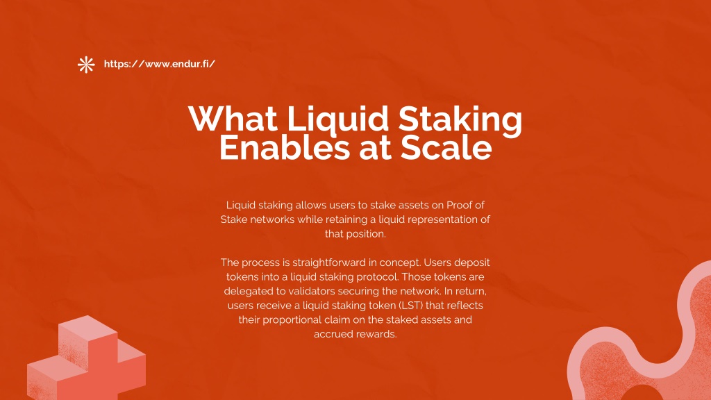 3. https://www.endur.fi/ What Liquid Staking Enables at Scale Liquid staking allows users to stake assets on Proof of Stake networks while retaining a liquid representation of that position. The process is straightforward in concept. Users deposit tokens into a liquid staking protocol. Those tokens are delegated to validators securing the network. In return, users receive a liquid staking token (LST) that reflects their proportional claim on the staked assets and accrued rewards.