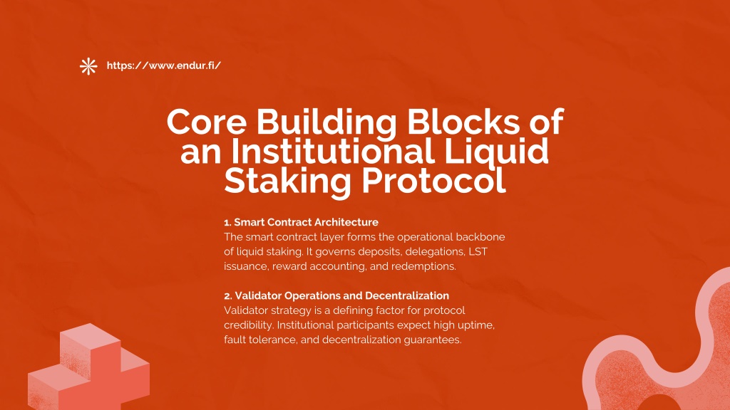 4. https://www.endur.fi/ Core Building Blocks of an Institutional Liquid Staking Protocol 1. Smart Contract Architecture The smart contract layer forms the operational backbone of liquid staking. It governs deposits, delegations, LST issuance, reward accounting, and redemptions. 2. Validator Operations and Decentralization Validator strategy is a defining factor for protocol credibility. Institutional participants expect high uptime, fault tolerance, and decentralization guarantees.