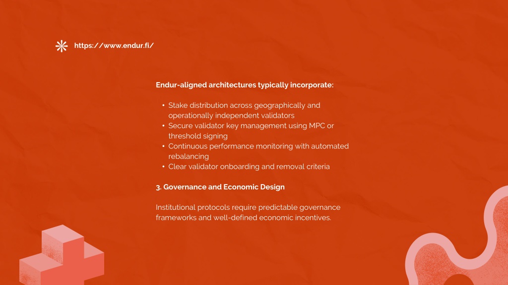 5. https://www.endur.fi/ • Endur-aligned architectures typically incorporate: • Stake distribution across geographically and operationally independent validators • Secure validator key management using MPC or threshold signing • Continuous performance monitoring with automated rebalancing • Clear validator onboarding and removal criteria • 3. Governance and Economic Design • Institutional protocols require predictable governance frameworks and well-defined economic incentives.