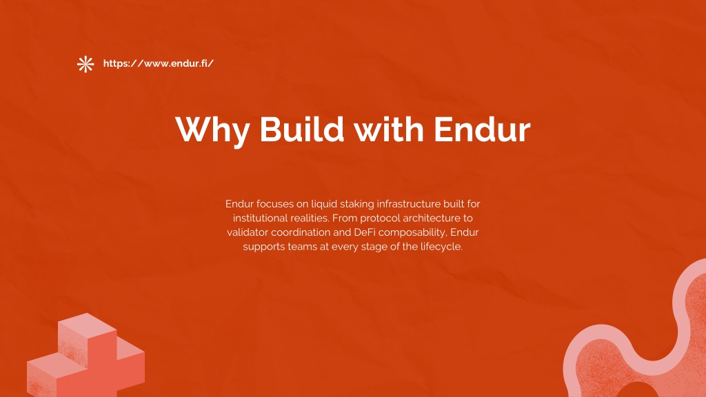 7. https://www.endur.fi/ Why Build with Endur Endur focuses on liquid staking infrastructure built for institutional realities. From protocol architecture to validator coordination and DeFi composability, Endur supports teams at every stage of the lifecycle.