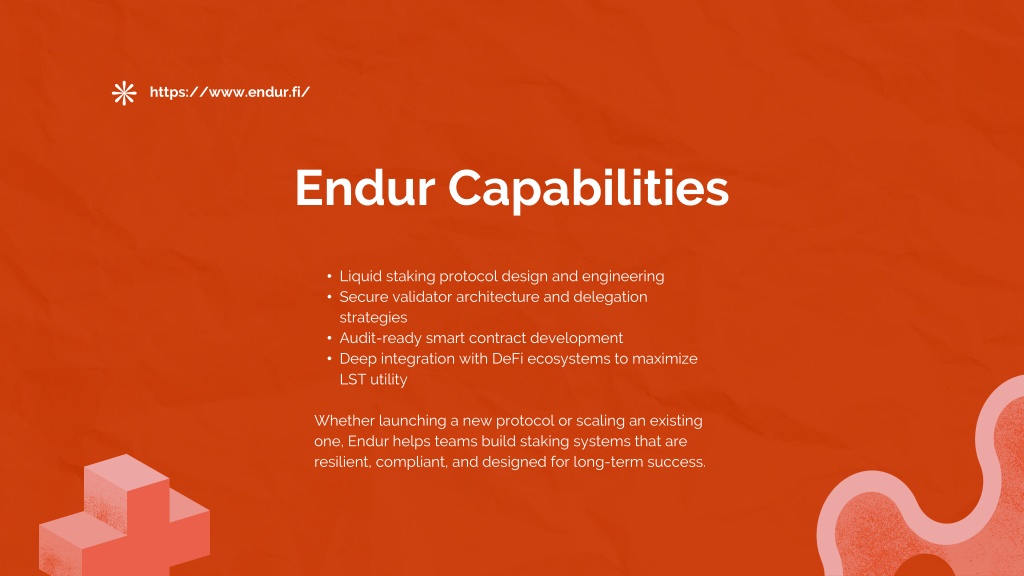 8. https://www.endur.fi/ Endur Capabilities • Liquid staking protocol design and engineering • Secure validator architecture and delegation strategies • Audit-ready smart contract development • Deep integration with DeFi ecosystems to maximize LST utility • Whether launching a new protocol or scaling an existing one, Endur helps teams build staking systems that are resilient, compliant, and designed for long-term success.