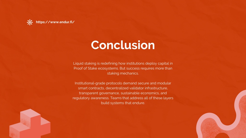 9. https://www.endur.fi/ Conclusion Liquid staking is redefining how institutions deploy capital in Proof of Stake ecosystems. But success requires more than staking mechanics. Institutional-grade protocols demand secure and modular smart contracts, decentralized validator infrastructure, transparent governance, sustainable economics, and regulatory awareness. Teams that address all of these layers build systems that endure.