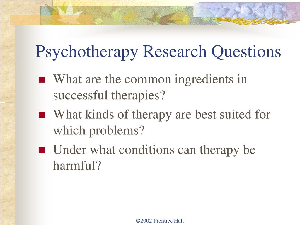 Psychotherapy Research Questions • What are the common ingredients in successful therapies? • What kinds of therapy are best suited for which problems? • Under what conditions can therapy be harmful? ©2002 Prentice Hall