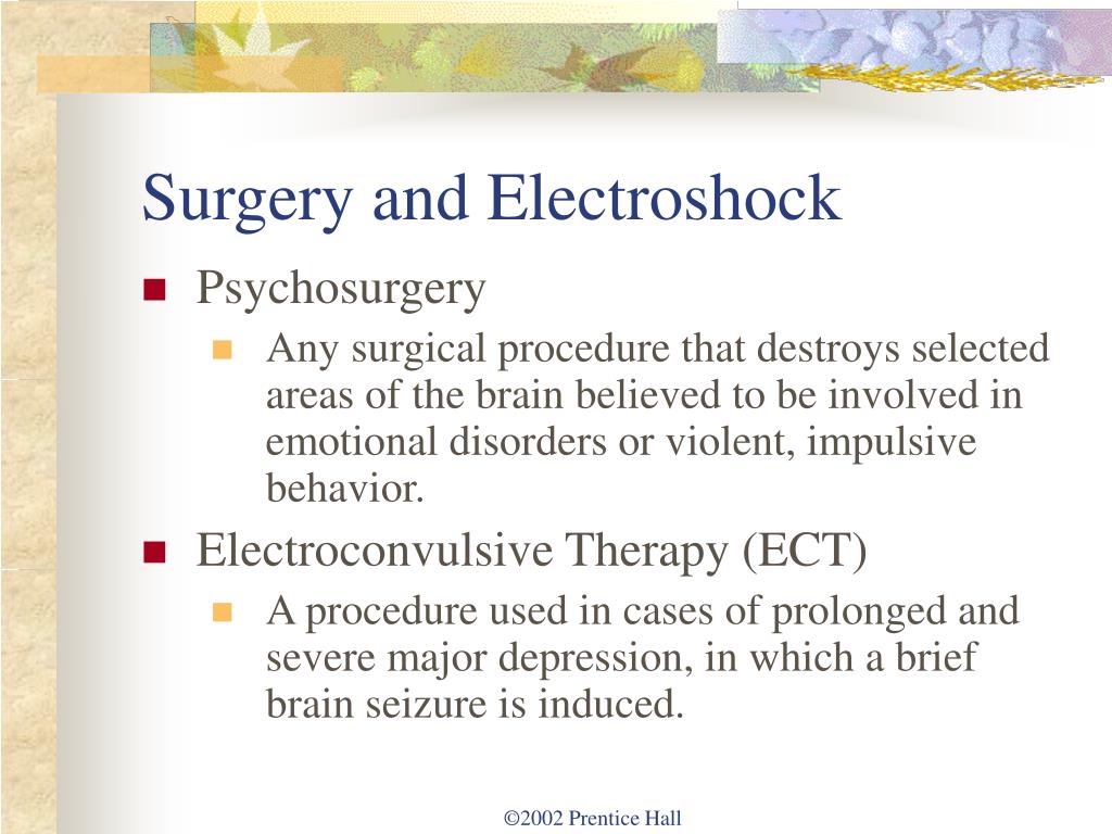 Surgery and Electroshock • Psychosurgery • Any surgical procedure that destroys selected areas of the brain believed to be involved in emotional disorders or violent, impulsive behavior. • Electroconvulsive Therapy (ECT) • A procedure used in cases of prolonged and severe major depression, in which a brief brain seizure is induced. ©2002 Prentice Hall