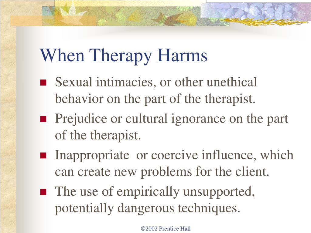 When Therapy Harms • Sexual intimacies, or other unethical behavior on the part of the therapist. • Prejudice or cultural ignorance on the part of the therapist. • Inappropriate or coercive influence, which can create new problems for the client. • The use of empirically unsupported, potentially dangerous techniques. ©2002 Prentice Hall