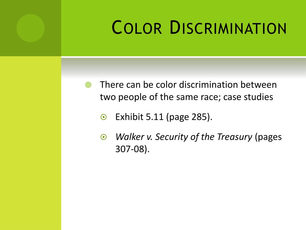Color Discrimination • There can be color discrimination between two people of the same race; case studies • Exhibit 5.11 (page 285). • Walker v. Security of the Treasury (pages 307-08).