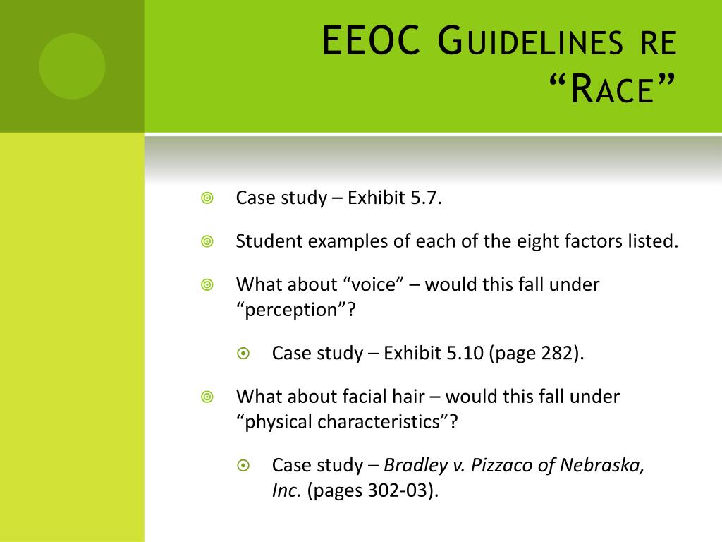 EEOC Guidelines re “Race” • Case study – Exhibit 5.7. • Student examples of each of the eight factors listed. • What about “voice” – would this fall under “perception”? • Case study – Exhibit 5.10 (page 282). • What about facial hair – would this fall under “physical characteristics”? • Case study – Bradley v. Pizzaco of Nebraska, Inc. (pages 302-03).