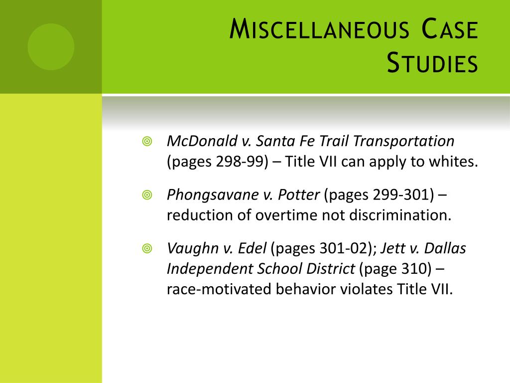 Miscellaneous Case Studies • McDonald v. Santa Fe Trail Transportation (pages 298-99) – Title VII can apply to whites. • Phongsavane v. Potter (pages 299-301) – reduction of overtime not discrimination. • Vaughn v. Edel (pages 301-02); Jett v. Dallas Independent School District (page 310) – race-motivated behavior violates Title VII.