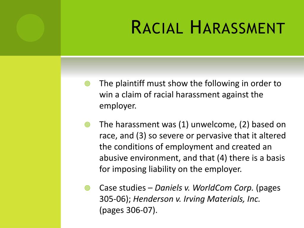 Racial Harassment • The plaintiff must show the following in order to win a claim of racial harassment against the employer. • The harassment was (1) unwelcome, (2) based on race, and (3) so severe or pervasive that it altered the conditions of employment and created an abusive environment, and that (4) there is a basis for imposing liability on the employer. • Case studies – Daniels v. WorldCom Corp. (pages 305-06); Henderson v. Irving Materials, Inc. (pages 306-07).
