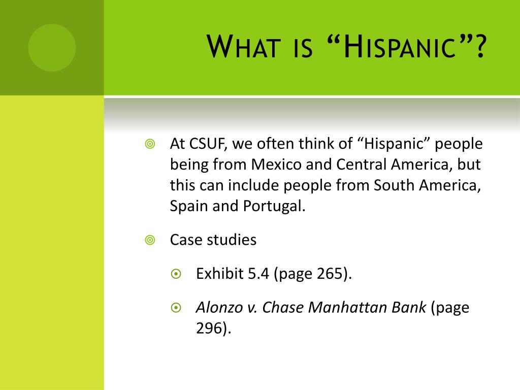 What is “Hispanic”? • At CSUF, we often think of “Hispanic” people being from Mexico and Central America, but this can include people from South America, Spain and Portugal. • Case studies • Exhibit 5.4 (page 265). • Alonzo v. Chase Manhattan Bank (page 296).