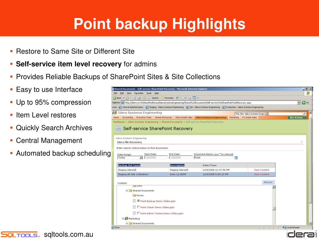 Idera – SharePoint Tools sqltools.com.au Point backup - backup & recovery for SharePoint