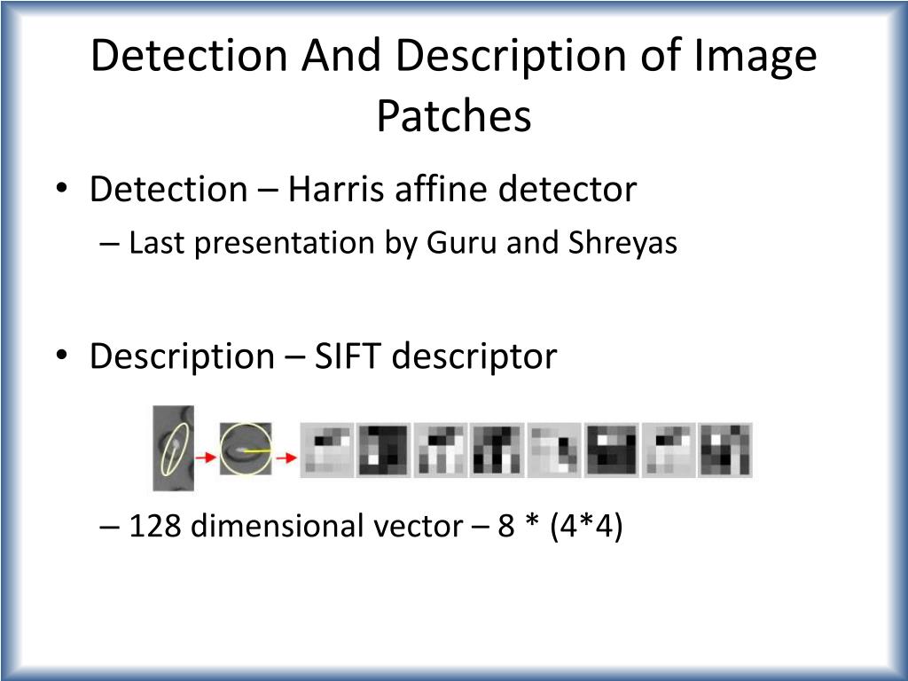 Detection And Description of Image Patches • Detection – Harris affine detector • Last presentation by Guru and Shreyas • Description – SIFT descriptor • 128 dimensionalvector – 8 * (4*4)