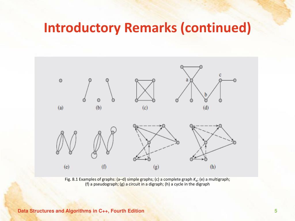 Introductory Remarks (continued) Fig. 8.1 Examples of graphs: (a–d) simple graphs; (c) a complete graph K4; (e) a multigraph; (f) a pseudograph; (g) a circuit in a digraph; (h) a cycle in the digraph Data Structures and Algorithms in C++, Fourth Edition
