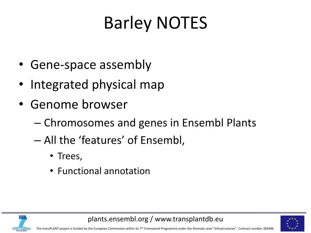 Barley NOTES • Gene-space assembly • Integrated physical map • Genome browser • Chromosomes and genes in Ensembl Plants • All the ‘features’ of Ensembl, • Trees, • Functional annotation