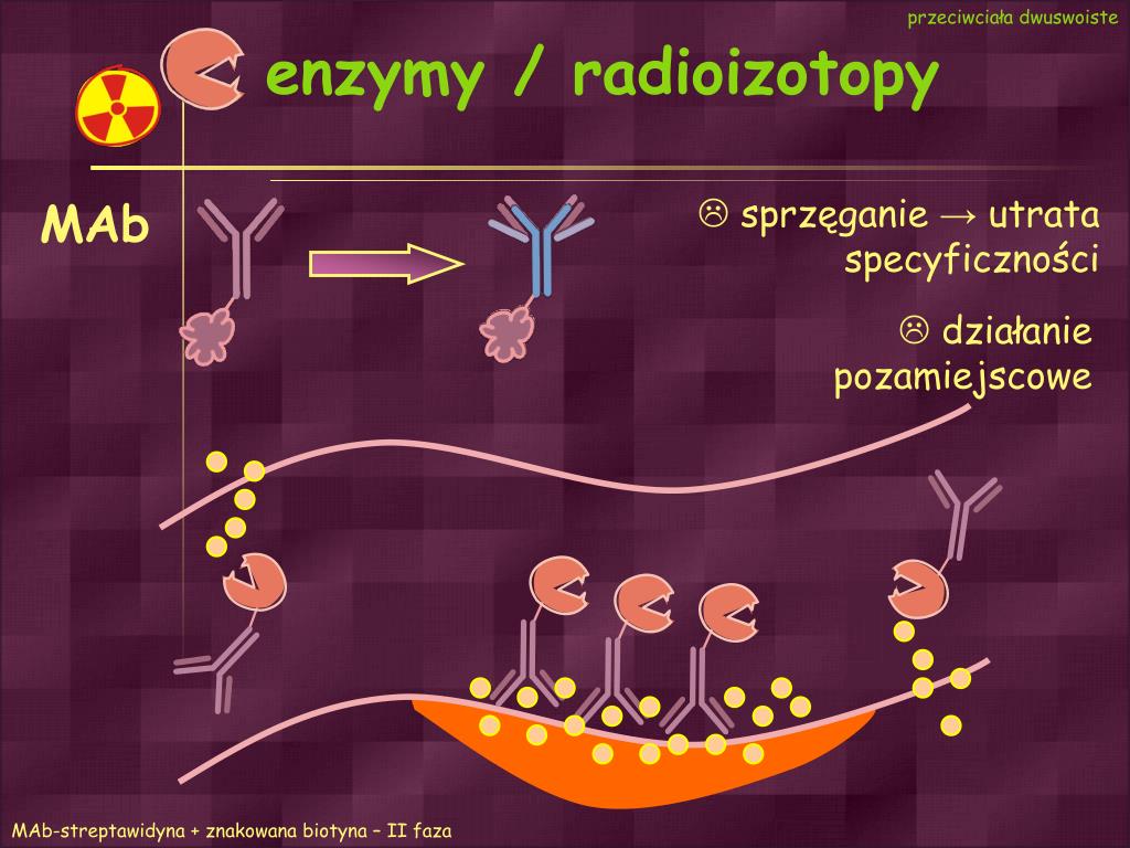 przeciwciała dwuswoiste enzymy / radioizotopy sprzęganie → utrata specyficzności MAb działanie pozamiejscowe MAb-streptawidyna + znakowana biotyna – II faza