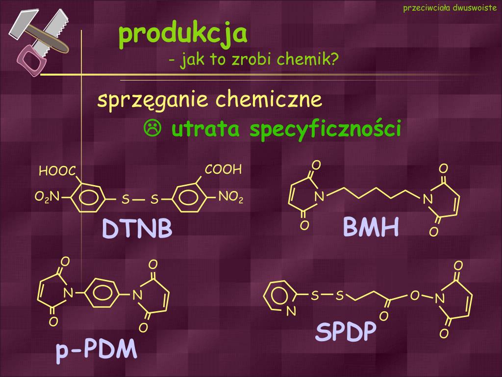 przeciwciała dwuswoiste O O O N S S O N N N O O COOH HOOC O O NO2 O2N S S O O N N O O produkcja - jak to zrobi chemik? sprzęganie chemiczne utrata specyficzności BMH DTNB SPDP p-PDM