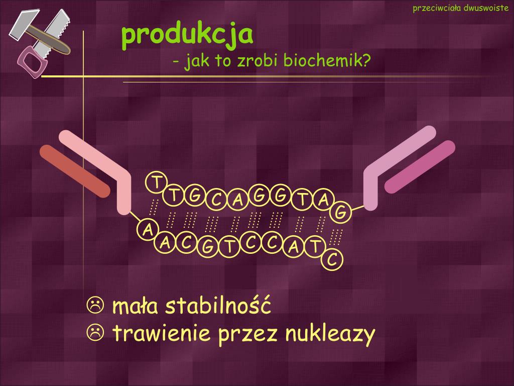 przeciwciała dwuswoiste T T G G G C A T A G A A C C C G T A T C produkcja - jak to zrobi biochemik? mała stabilność trawienie przez nukleazy
