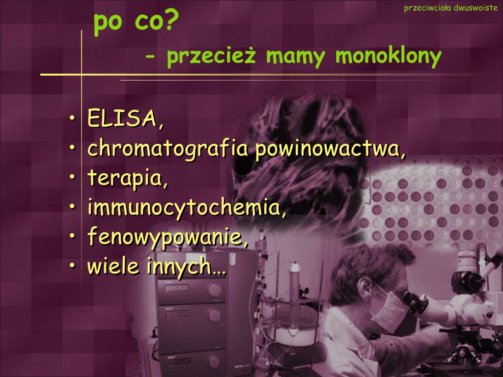 po co? - przecież mamy monoklony przeciwciała dwuswoiste • ELISA, • chromatografia powinowactwa, • terapia, • immunocytochemia, • fenowypowanie, • wiele innych…