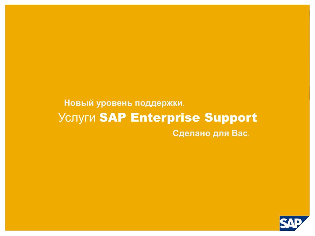 Услуги SAP ENTERPRISE SUPPORTНаиболее полный пакет • Непрерывное совершенствование • Обновление и модернизация программного обеспечения SAP (новые версии, пакеты поддержки и изменения законодательства, обновление технологий) • Доступность исходного кода на языке ABAP • Управление изменениями программного обеспечения (шаблоны, перспективные планы и т. д.) • Расширенная поддержка продуктов Непрерывная проверка качества • Удаленное обслуживание для решения наиболее важных вопросов, возникающих при внедрении, эксплуатации и модернизации • Аварийные сообщения SAP EarlyWatch Alert • Решение проблем • База знаний, инструмент Note Assistant • Соглашение об уровне сервисного обслуживания • Круглосуточное глобальное решение проблем 7 дней в неделю • Глобальные сдерживающие процедуры доступны круглосуточно 7 дней в неделю • Консультативный центр поддержки (Support Advisory Center) • Круглосуточная поддержка 7 дней в неделюдля критически важных проблем • Канал прямой связи с SAP, предоставляющий советы и поддержку по наиболее важным вопросам Платформа SAP Solution Manager Enterprise Edition Техническая основа SAP Enterprise Support, объединяющая инструменты, контент и прямой доступ к SAP Всемирная сеть поддержки SAP Global Support Backbone Современная технология поддержки
