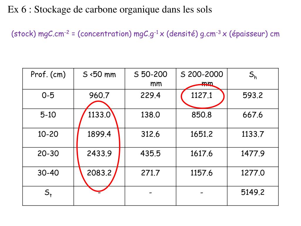 Ex 6 : Stockage de carbone organique dans les sols (stock) mgC.cm-2 = (concentration) mgC.g-1 x (densité) g.cm-3 x (épaisseur) cm