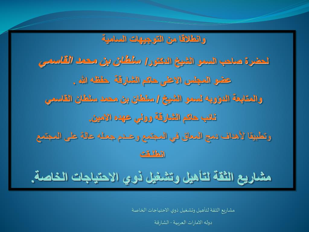 وانطلاقا من التوجيهات السامية لحضرة صاحب السمو الشيخ الدكتور/ سلطان بن محمد القاسمي عضو المجلس الاعلى حاكم الشارقة حفظه الله . والمتابعة الدؤوبه لسمو الشيخ / سلطان بن محمد سلطان القاسمي نائب حاكم الشارقة وولي عهده الامين. وتطبيقا لأهداف دمج المعاق في المجتمع وعــدم جعـله عالة على المجتمع انطلـقت مشاريع الثقة لتأهيل وتشغيل ذوي الاحتياجات الخاصة. مشاريع الثقة لتأهيل وتشغيل ذوي الاحتياجات الخاصة دوله الامارات العربية - الشارقة