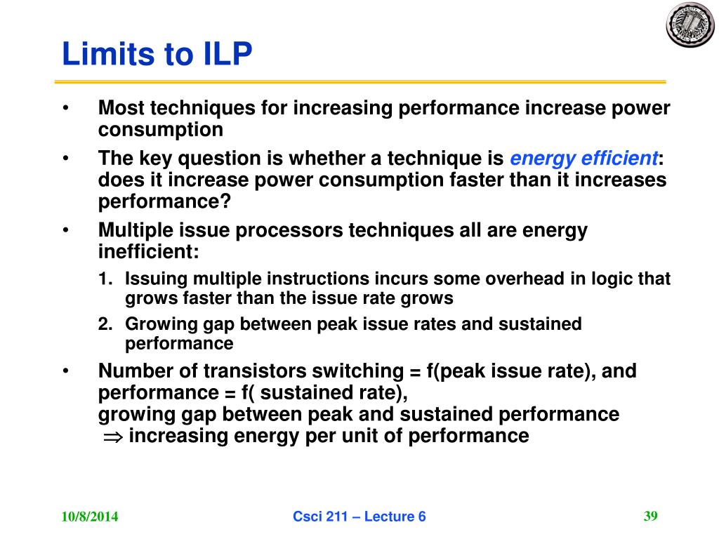 Limits to ILP • Most techniques for increasing performance increase power consumption • The key question is whether a technique is energy efficient: does it increase power consumption faster than it increases performance? • Multiple issue processors techniques all are energy inefficient: • Issuing multiple instructions incurs some overhead in logic that grows faster than the issue rate grows • Growing gap between peak issue rates and sustained performance • Number of transistors switching = f(peak issue rate), and performance = f( sustained rate), growing gap between peak and sustained performance increasing energy per unit of performance Csci 211 – Lecture 6