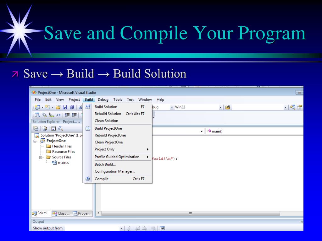 Open an Existing Program If your project is named projectOne: • Find the projectOne folder at the location where you saved your project. • In the projectOne folder, double click on the file projectOne.vcproj, or projectOne.sln. • Double click on the .c file (e.g. main.c) will only open up the code file. It will not let you compile or run the program using Visual Studio 2008.