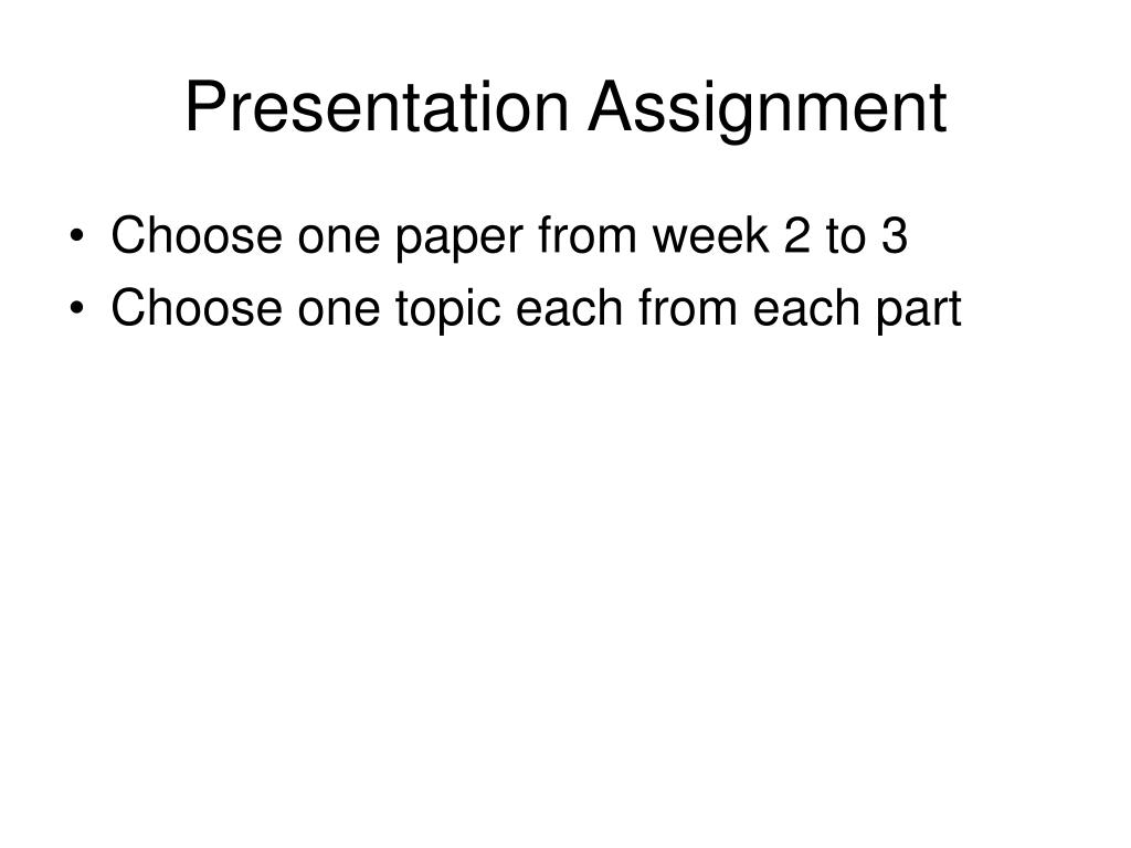 Presentation Assignment • Choose one paper from week 2 to 3 • Choose one topic each from each part