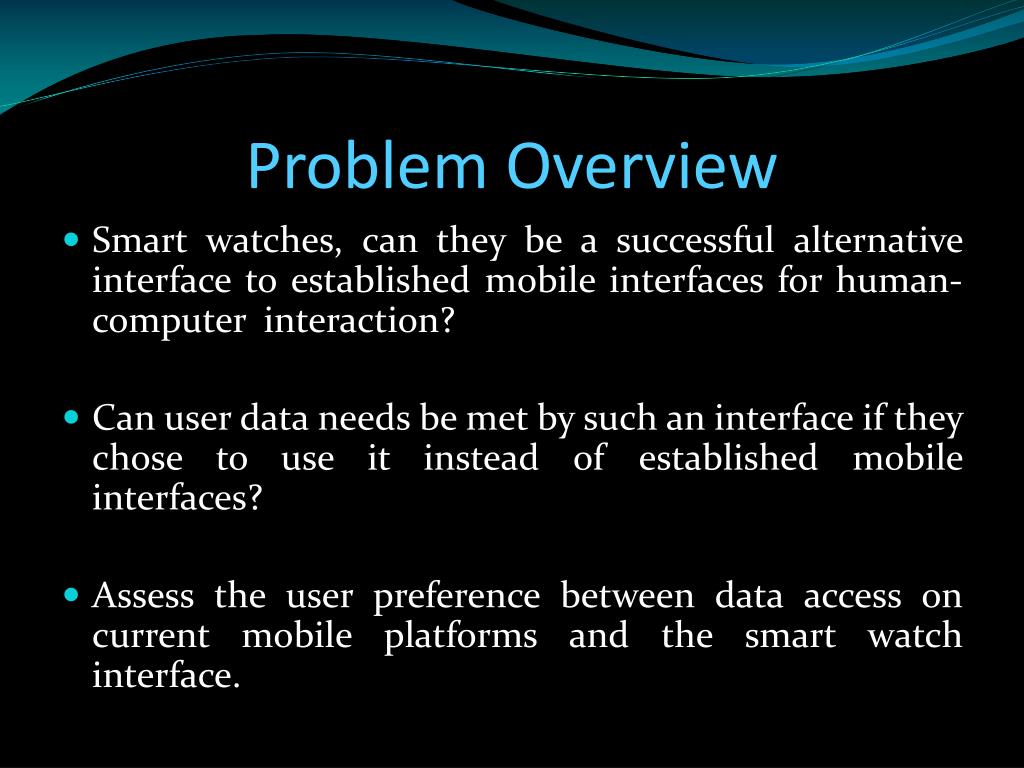 Problem Overview • Smart watches, can they be a successful alternative interface to established mobile interfaces for human-computer interaction? • Can user data needs be met by such an interface if they chose to use it instead of established mobile interfaces? • Assess the user preference between data access on current mobile platforms and the smart watch interface.
