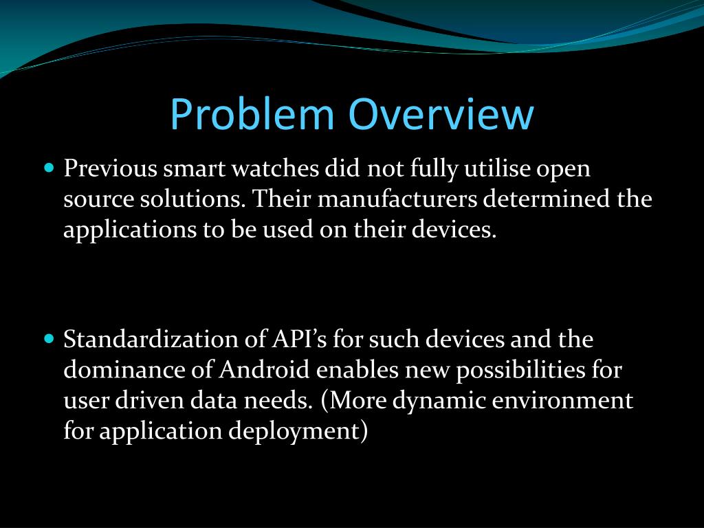 Problem Overview • Previous smart watches did not fully utilise open source solutions. Their manufacturers determined the applications to be used on their devices. • Standardization of API’s for such devices and the dominance of Android enables new possibilities for user driven data needs. (More dynamic environment for application deployment)