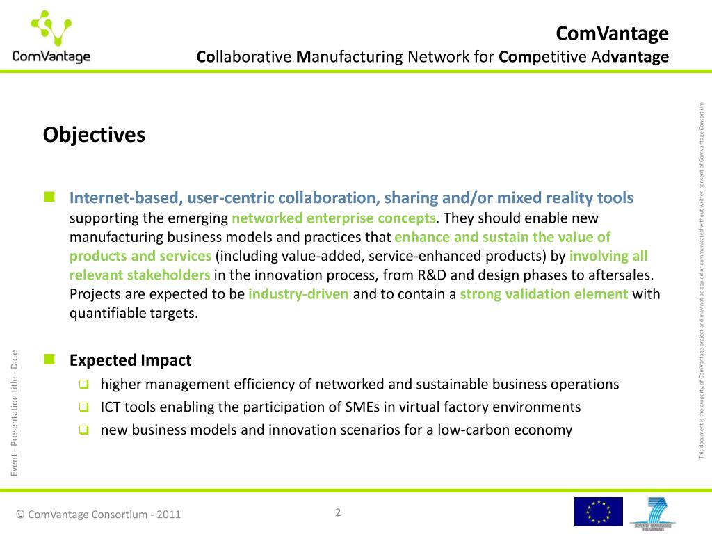 ComVantageCollaborative Manufacturing Network for Competitive Advantage Objectives • Internet-based, user-centric collaboration, sharing and/or mixed reality toolssupporting the emerging networked enterprise concepts. They should enable new manufacturing business models and practices that enhance and sustain the value of products and services (including value-added, service-enhanced products) by involving all relevant stakeholders in the innovation process, from R&D and design phases to aftersales. Projects are expected to be industry-driven and to contain a strong validation element with quantifiable targets. • Expected Impact • higher management efficiency of networked and sustainable business operations • ICT tools enabling the participation of SMEs in virtual factory environments • new business models and innovation scenarios for a low-carbon economy