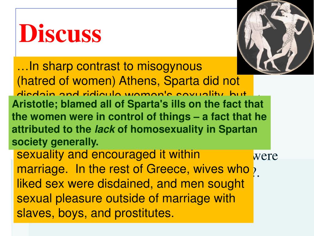 Discuss …In sharp contrast to misogynous (hatred of women) Athens, Sparta did not disdain and ridicule women's sexuality, but respected it. Sparta's laws recognized women's sexuality and encouraged it within marriage. In the rest of Greece, wives who liked sex were disdained, and men sought sexual pleasure outside of marriage with slaves, boys, and prostitutes. Aristotle;blamed all of Sparta's ills on the fact that the women were in control of things – a fact that he attributed to the lack of homosexuality in Spartan society generally. Taboos today cannibalism, female circumcision, incest, paedophilia, masturbation, etc. Consider, were these always taboos or were there some societies that accepted them?.