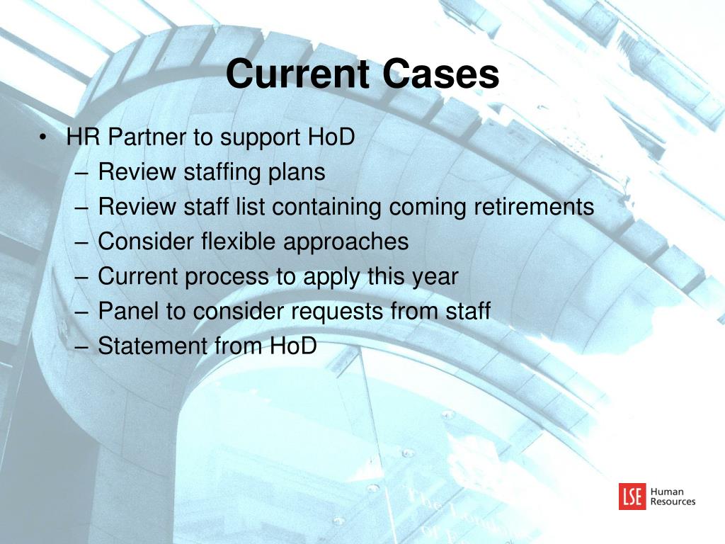 Current Cases • HR Partner to support HoD • Review staffing plans • Review staff list containing coming retirements • Consider flexible approaches • Current process to apply this year • Panel to consider requests from staff • Statement from HoD