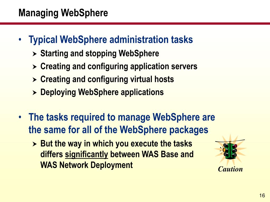 Caution Managing WebSphere • Typical WebSphere administration tasks • Starting and stopping WebSphere • Creating and configuring application servers • Creating and configuring virtual hosts • Deploying WebSphere applications • The tasks required to manage WebSphere are the same for all of the WebSphere packages • But the way in which you execute the tasks differs significantly between WAS Base and WAS Network Deployment